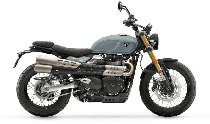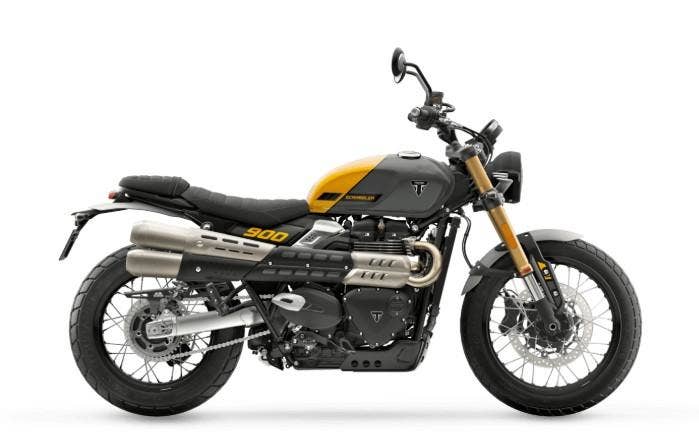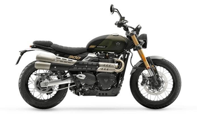 Triumph Scrambler 900 je moderní klasika, která spojuje výrazný retro vzhled s všestranností pro jízdu na silnici i lehký terén. Pohání jej kapalinou chlazený dvouválcový motor o objemu 900 cm³ s výkonem 64 koní při 7 250 ot./min a točivým momentem 80 Nm při 3 250 ot./min, který nabízí plynulé zrychlení a silný zátah už od nízkých otáček. Motocykl je vybaven třemi jízdními režimy Road, Rain a Off-Road, přičemž v terénním režimu lze upravit chování ABS a kontroly trakce pro lepší kontrolu na nezpevněném povrchu. Podvozek tvoří 41mm přední vidlice a zadní dvojice tlumičů s nastavitelným předpětím, což zajišťuje komfortní a jistý projev na různých typech povrchů. Brzdovou soustavu představuje přední 310mm kotouč se čtyřpístkovým třmenem Brembo a zadní 255mm kotouč s dvoupístkovým třmenem Nissin. Díky výšce sedla 790 mm, provozní hmotnosti 223 kg a 19″ přednímu kolu s pneumatikami Metzeler Tourance je Scrambler 900 ideální volbou pro jezdce, kteří chtějí kombinaci klasického stylu, moderní technologie a schopnosti zvládat rozmanité jízdní podmínky.